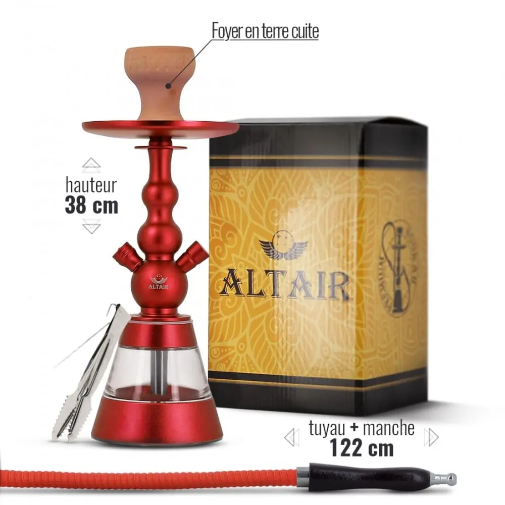 altair khephren hookah 38 cm high.. this shisha offers you a very modern design with a very pretty finish.. this one will be delivered to you with a hearth a charcoal tongs and a pipe with matching handle.. color red and transparent..