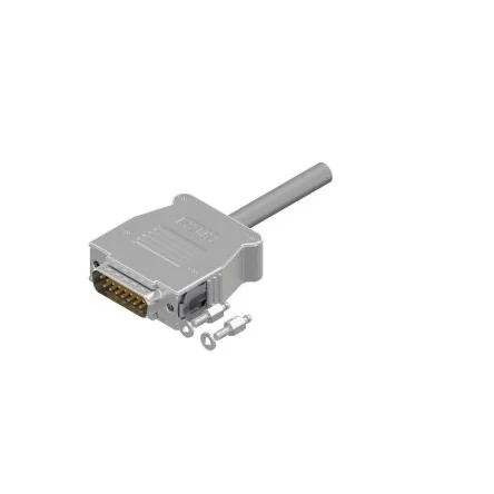This 15-way male D-sub connector plug features a straight body orientation and snap lock mounting.