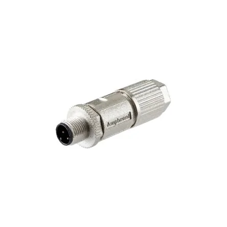 This Amphenol M12 male plug connector features 4 contacts and an IP68 rating for durable cable mounting.