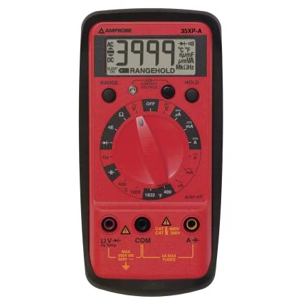 1000 V cat.I, 600 V cat.II, 300 cat.III. Pair of standard test leads Carrying case Magne-Grip™ holder with hanging strap Temperature adapter Type K thermocouple probe 9 V battery (installed) User manual. Amprobe 35XP-A Digital Multimeter with Temperature. The compact 35XP-A Digital Multimeter offers all the right features for HVAC and plant maintenance. It measures temperature, plus capacitance for motor run/start test, and offers 0.1 µA resolution for flame sensor testing. Features and Benefits:. Compact, multifunction digital multimeter for industrial maintenance, heating/ventilation/air conditioning/refrigeration, electricity and electronic applications Automatic ranges for fast measurements 4000 point resolution, basic accuracy of 0.5 % 750 Vac / 1000 Vdc 2A AC/DC, resolution of 0.1 µA for flame detector tests Frequency of up to 20 MHz Resistance of up to 40 Mohms Temperature with type K thermocouple up to 1000 °C Capacitance of up to 4000 µF for engine function/start-up tests Audible continuity indicator Display freeze Diode test Voldetect™ Magne-Grip™ case Device auto-stop Anti-overload/input alarm protection