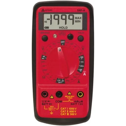 CAT III 300 V, CAT II 600 V, CAT I 1000 V. Carrying case Magne-Grip™ holder with hanging strap Users manual Test leads Battery. Amprobe 5XP-A AC/DC Compact Digital Multimeter with VolTect. The Amprobe 5XP-A Digital Multimeter provides superior features and accuracy in a smaller form factor. The 5XP-A has unique features such as VolTect™ non-contact voltage detection and our exclusive Magne-Grip™ holster that frees both hands for work. The 5XP-A is the perfect choice for residential, commercial and general troubleshooting applications. Features and Benefits:. General purpose compact multimeter Designed for general repair applications in a commercial or residential environment 2000 points, basic accuracy of 1 % 27 rages / 10 functions 750 Vac / 1000 Vdc.Current 200 mA AC / DC Resistance of up to 20 Mohms Audible continuity indicator Diode test Battery test (1.5 and 9 volts) with charge Min / Max function including memory of min. and max. values VolTect™ Magne-Grip™ case Display freeze Anti-overload/input alarm protection