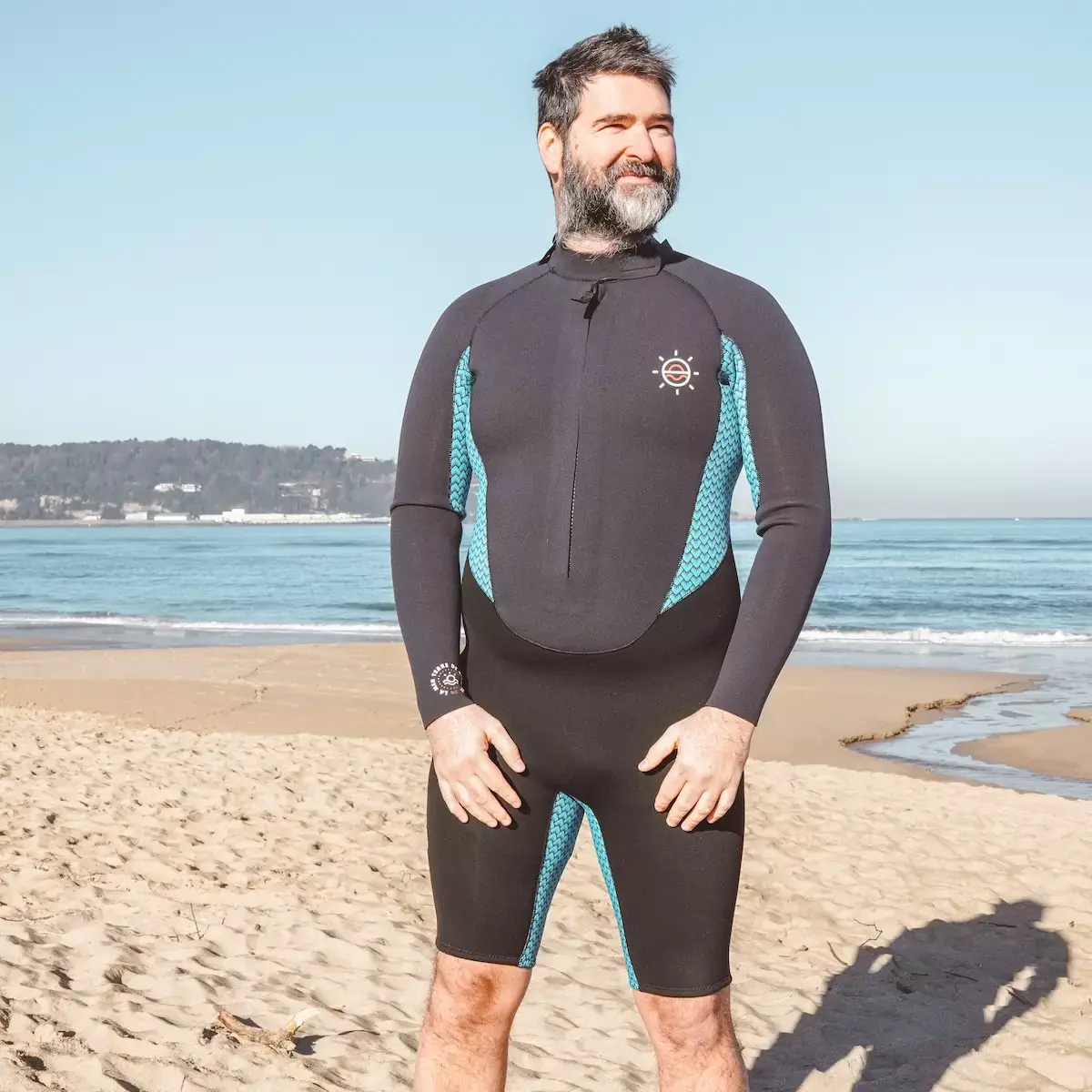 The Anfibi Men's 4/3 mm Long Sleeve Double Zip Shorty De Longe-Côte is a high-performance wetsuit designed for aquatic walking, swimming, surfing, stand-up paddleboarding, and other water sports. Crafted from 100% Ultra Stretch Neoprene, it offers exceptional flexibility and comfort, allowing for a full range of motion during water activities.