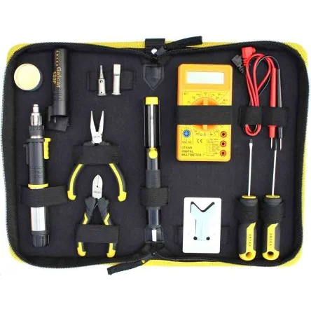 does not contain tubing or solder. Gascat 120 Toolkit. An engineers toolkit featuring an Antex Gascat 120 butane gas powered soldering iron, a variety of tools manufactured from high grade long lasting materials, complete with non-slip bi-material handles. Also includes a digital multimeter with leads. The tool provides excellent portability, lasting approximately 2 hours before requiring refilling. This is easily done in seconds with a standard butane gas lighter refill canister.The temperature is adjustable on the body of the tool.The tool can also be used for heatshrinking, and even as a hot knife for cutting plastics or sealing rope. Features and benefits:. 115mm mini side cutters - C45 carbon steel 115mm mini long nose pliers - C45 carbon steel Screwdriver - Size: 3x75mm, Hardened Chrome Vadium steel - Magnetic tip Screwdriver - Size: PH0x75mm, Hardened Chrome Vadium steel - Magnetic tip Desoldering pump Gascat 120 iron with auto ignition Gas soldering tip Gas Flame tip Hot Knife tip Sponge tray Digital multimeter Weight - 950g Dimensions - 300 x 180 x 50 mm