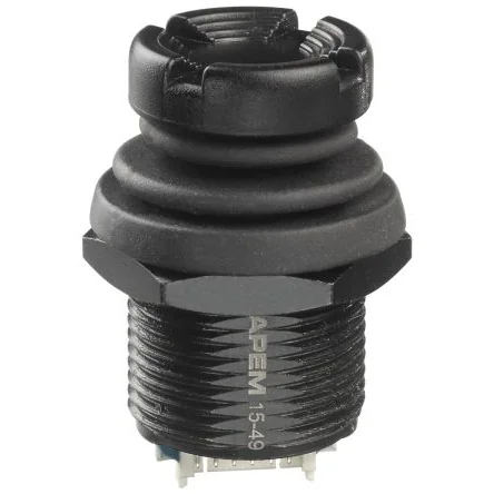 Apem NV Series Thumbstick. The NV series is 4 or 5-direction switch-based joystick (4 directions + pushbutton). Contrary to most navigators currently on the market, the NV series provides enhanced tactile feedback in 4 directions plus pushbutton. This results in improved haptics and extremely precise control associated with a compact size (bushing dia. 16 mm). With its chrome plated metal case and IP69K sealing level, the NV series withstands all types of adversity including water, frost, dust, sand, and hydrocarbons. Designed for the harshest environments, the NV series is extremely robust and maintains its tactile effect even during excessive shock or vibrations. Features and Benefits. • Positive tactile feedback in all directions • Sealed to IP69K • Compact and low profile • Robust: shock, vibration and salt spray resistant • Two actuator shapes • Numerous actuator colors