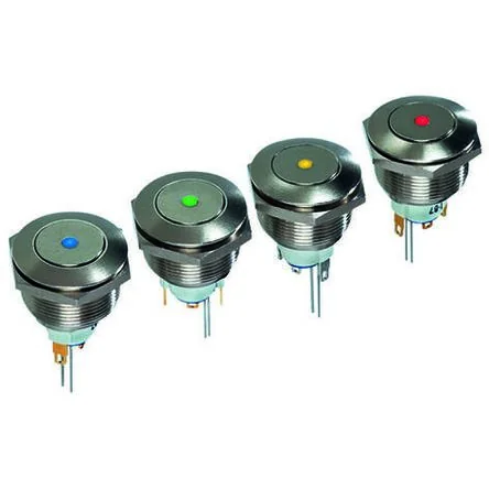 Illuminated anti-vandal pushbutton switches Ø 22 mm ON/OFF latching action– series AV. Dual ON/OFF electrical function. Very robust. Stainless steel or nickel plated brass. Sealing for stainless steel version. Blue, red, green or yellow illuminated dot. Panel thickness:1 to 9 mm max. Solder lugs.