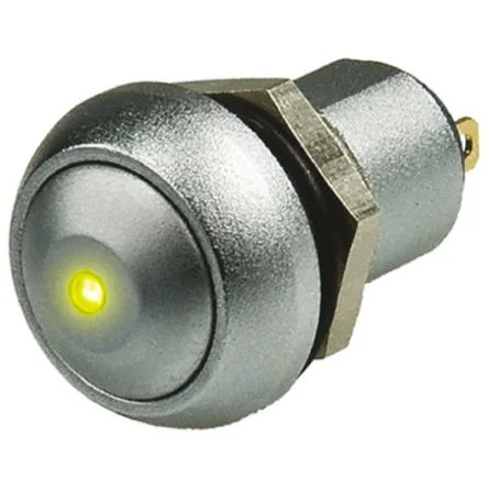 Durable illuminated push button switch with yellow LED, perfect for harsh environments.