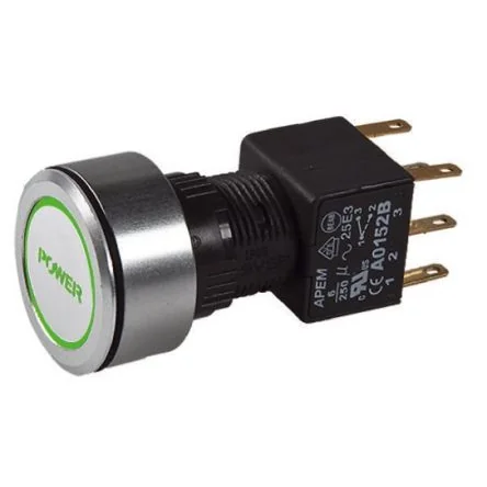 This APEM illuminated push button switch features a durable design with a green LED for easy visibility.