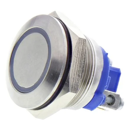 Robust illuminated push button switch with momentary action and blue LED for reliable performance.