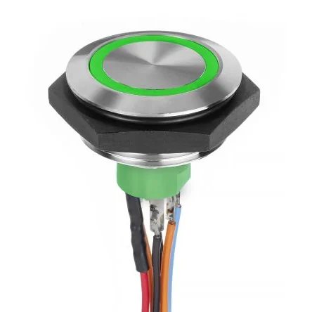 Durable illuminated push button switch with a momentary action and IP67 rating for reliable performance.