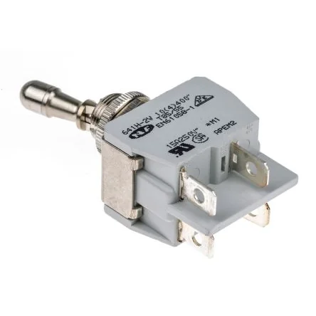 UL, CSA, VDE, SEMKO. APEM 600H Toggle Switch. Single and double pole, mechanical locking metal levers for panel mounting. Normally open contact function (ON-OFF). Connection by 6.3 mm Faston lugs or solder lugs. Accepts seal covers U851.