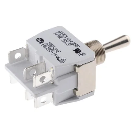 For biased switches (on) refers to momentary (on) position. Toggle Switches, Std, 15A Metal Lever. Single and double pole switches with a choice of flat insulated or nickel plated brass levers. 12mm mounting bush 250 ( 1/4 in.) terminals Brass actuator and Melamine/Polyester case Silver/Nickel Alloy contacts