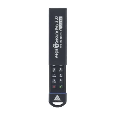 Aegis Secure Key 3.0 Brings a World of Advanced Data Protection Easy to use FIPS 140-2 Level 3 validated USB 3.0 flash drive with on-the-fly AES hardware encryption and secure PIN access With software-free operation, cross-platform compatibility, USB 3.0 speed, increased capacities of up to 480GB, plus a host of high-level security features that you’d never expect to find in a flashkey, Apricorn’s Aegis Secure Key 3.0 brings a world of advanced data security to your fingertips.PIN activated 7-16 digits - Alphanumeric keypad use a memorable number or word for your PIN Military grade AES 256-bit XTS hardware encryption No software or drivers involved Crypto-parameters protected with SHA-256 hashing IP58 Certified Epoxy-filled internal compartment encases all electronic components, tamper-evident and tamper-resistant Supports Admin and User independent PINs Auto-lock on USB port removal or after predetermined period of inactivity
