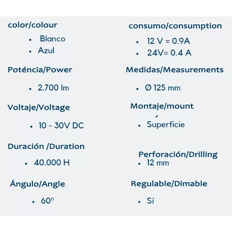 | Detailed Specifications | The aqua 927 is an underwater led light designed and produced in stainless steel 316 available in different colours as white or blue, The AQUA927 offers 27 W power and 2700lm and a power consumption of 0.8 A at 12 V, this product is multivoltage product 10 to 30 V DC and is dimmable - ideal for boats >12m /40ft is ideal for boats, swimming pools, marinas, fountains, etc.. |