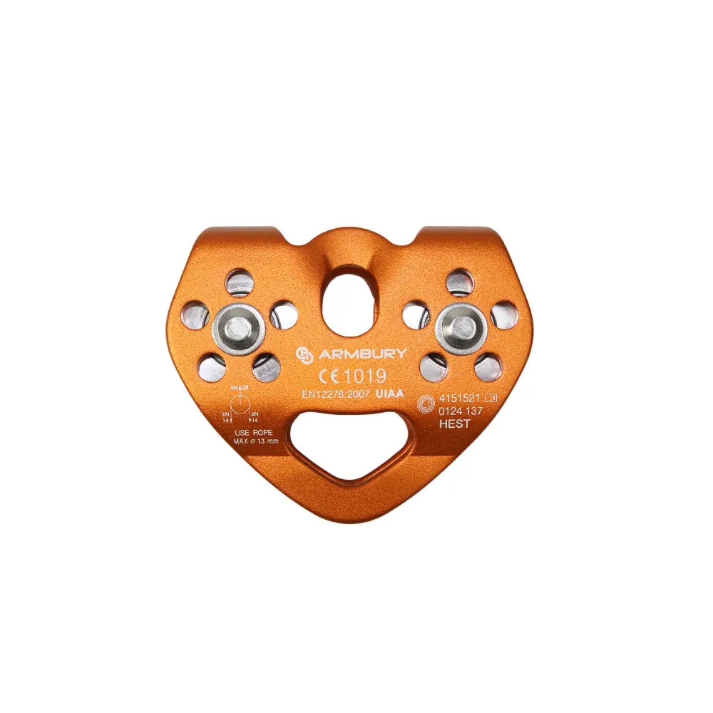 The ARMBURY HEST Mobile Side Double Pulley Orange is a professional piece of equipment intended for work at height, technical rescues, and acrobatic courses. Made from lightweight alloy, it features two stainless steel wheels mounted on ball bearings, ensuring excellent fluidity even under heavy load. It accommodates ropes and cables up to 13 mm in diameter, making it extremely versatile. Its wide eye allows for the simultaneous connection of three carabiners, facilitating complex setups. Compact and durable, it supports a minimum breaking load of 28 kN for a weight of only 245 g. Compliant with CE EN 12278 and UIAA standards, it is ideal for climbers seeking reliable, durable, and high-performance equipment in the field.