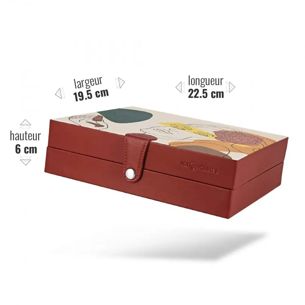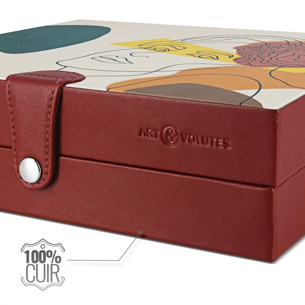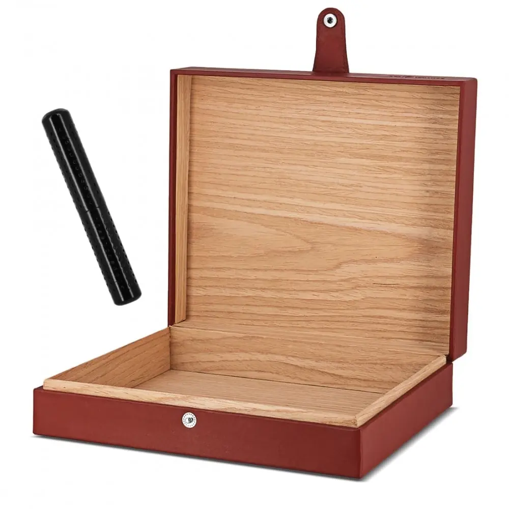 An elegant leather case with a cedar wood interior. Dressed in brick red leather and an artistic abstract style lid, this box is perfect for storing your cigars in a beautiful case. The cedar wood interior ensures ideal preservation while providing a noble and natural fragrance.