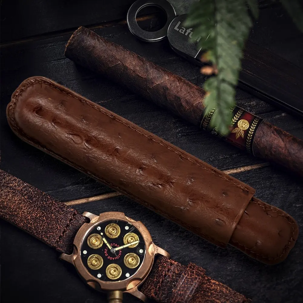 Elegant leather cigar holder designed for one cigar, adjustable for length and diameter.