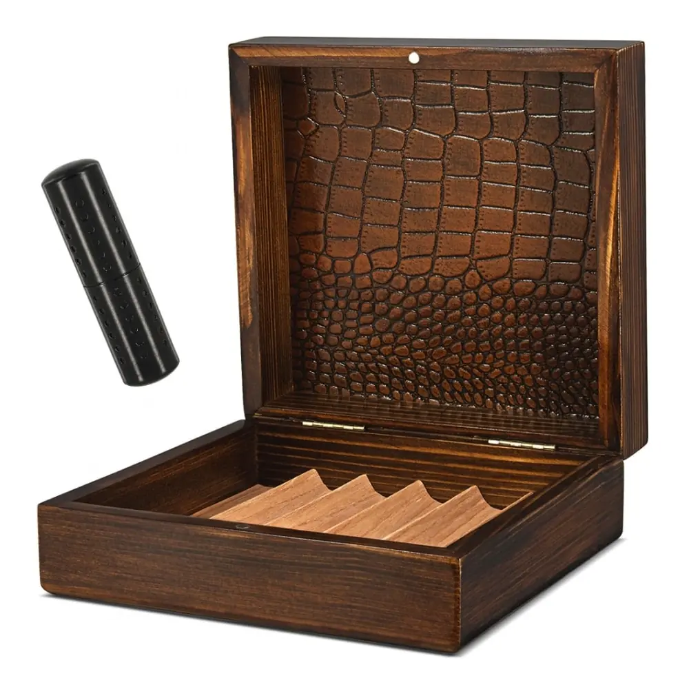 cigar box in wood and crocodile-style leather inside for 6 cigars of max. diameter. 2.2 cm and length 15.2 cm. this small humidor is perfect for newcomers to the world of cigars or aficionados who want a small extra humidor.