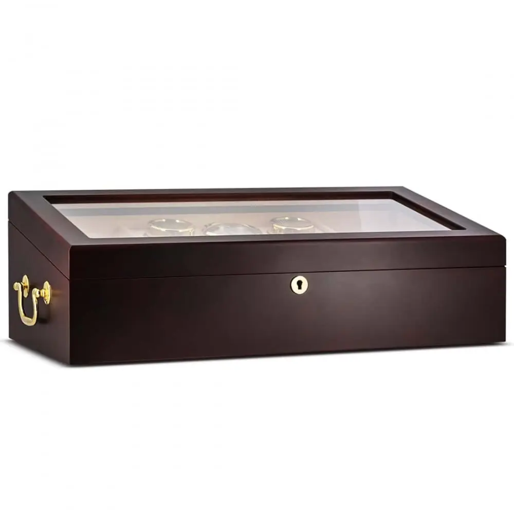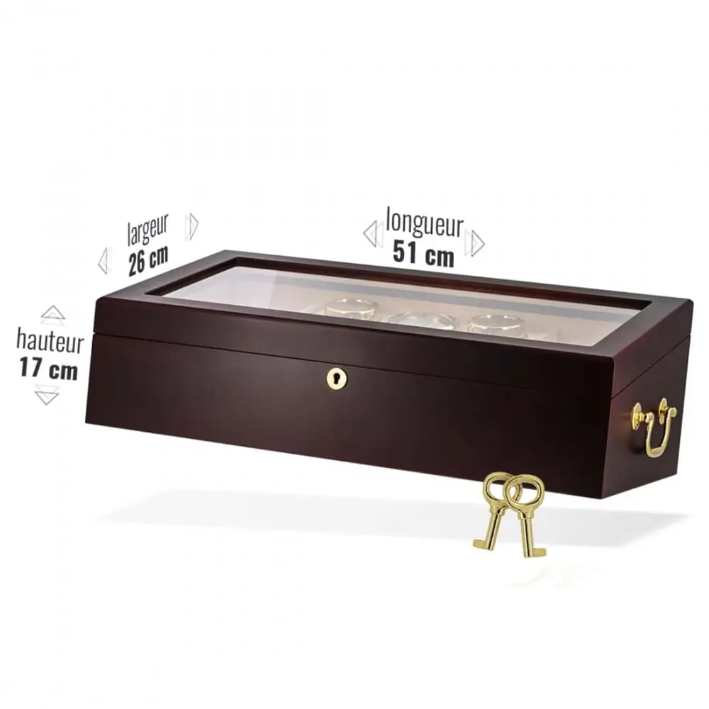 very nice cigar humidor that can hold a hundred cigars. in mahogany wood with glazed part on top. cedar wood inside. delivered with 2 humidifiers 1 needle hygrometer and a set of 2 keys.. . mark. art and swirls.