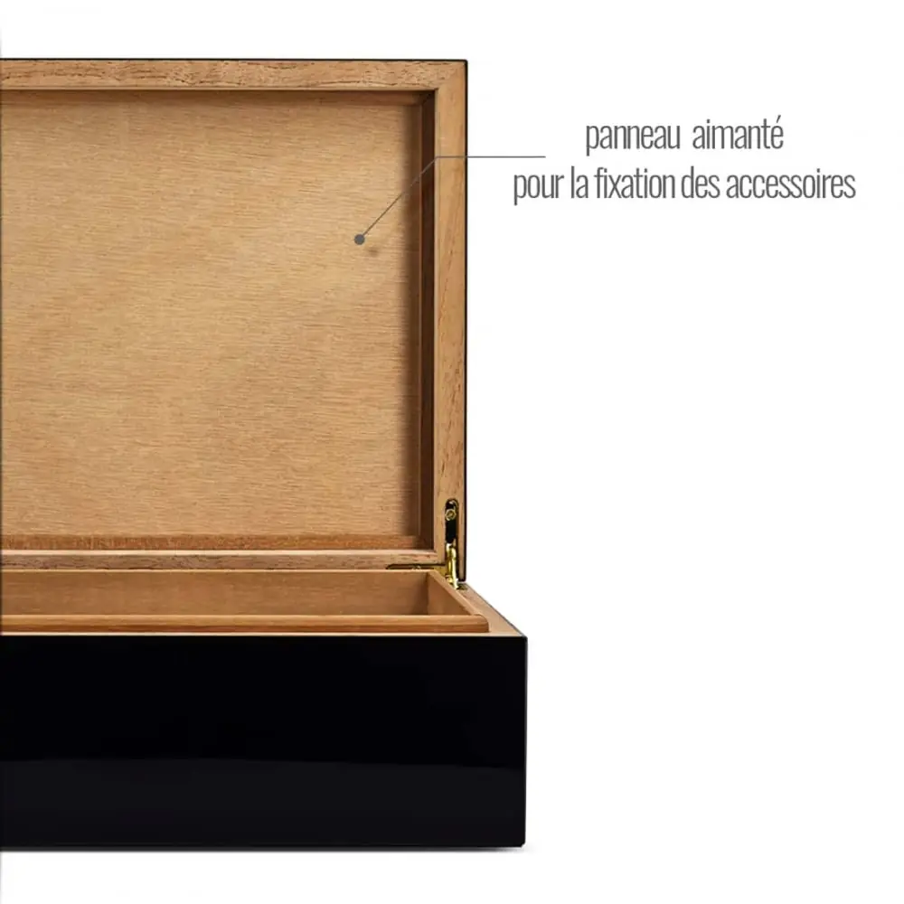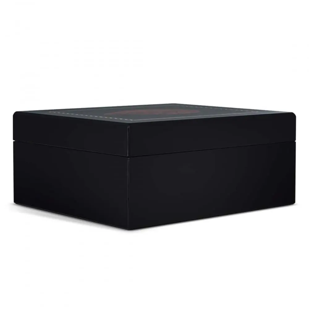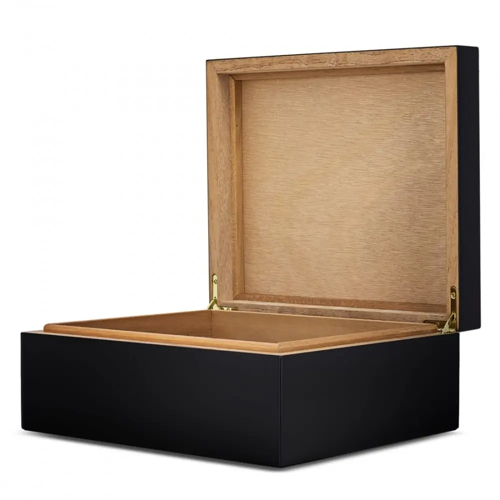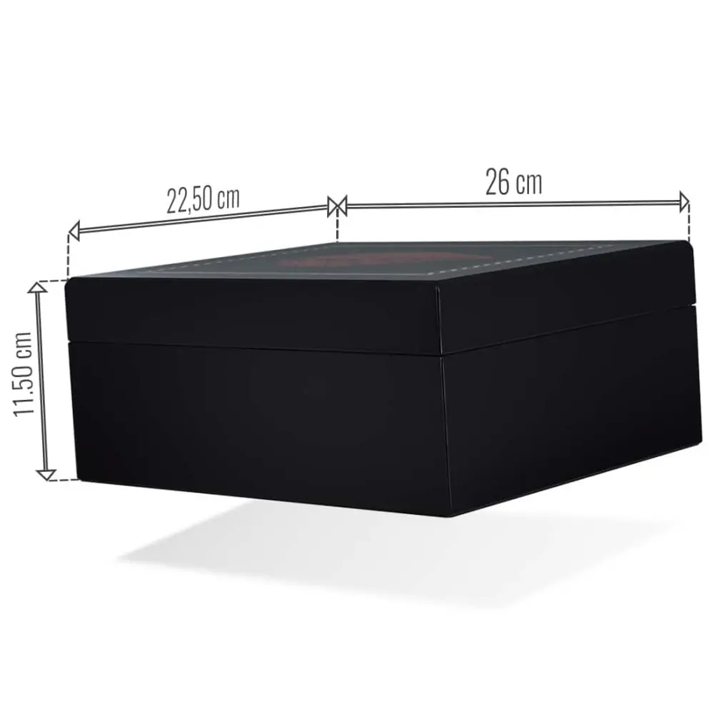 Beautiful little black cigar box decorated with a leaf on top. Cedar wood interior with a divider. Without hygrometer or humidifier or humidifier liquid. For about fifty cigars. Promises good preservation of cigars. Neat design.. . Mark. Art and swirls.. . Matter.
