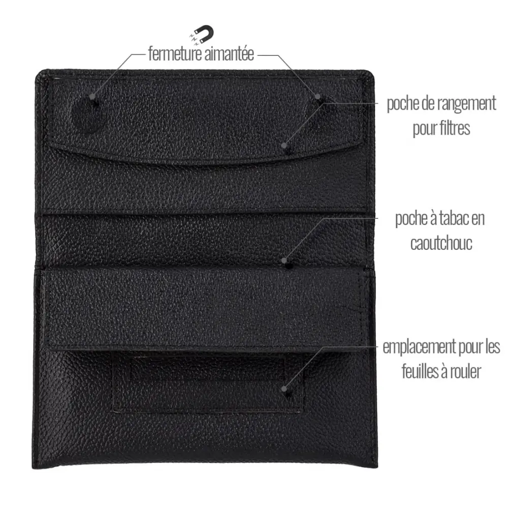the multiple storage spaces available in the goa leather tobacco pouch will fully satisfy you. four pockets are made of latex one of which is outside the pouch and closes with a zipper. this material has been specially chosen to best preserve your different tobaccos or anything you put in these pockets. closing the pouch is simple and extremely practical thanks to the two magnets hidden under the leather.