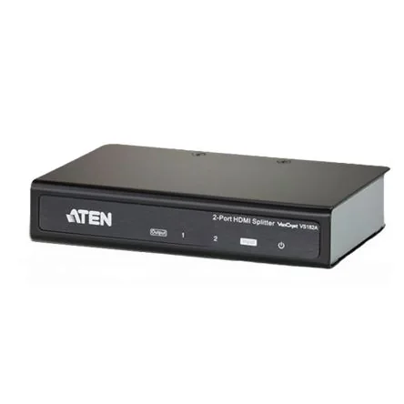 1x VS182A 2-Port HDMI Splitter 1x Power Adapter 1x HDMI Cable 1x User Instructions. 2-Port 4K HDMI Splitter. The Aten VS182A 2-Port HDMI Splitter is perfect for anyone who requires to send one source of digital high definition video to two displays simultaneously. Supports all HDMI-enabled equipment, such as DVD players, satellite set-top boxes and all HDMI displays. Connects one HDMI source to two HDMI displays at the same time HDMI (3D, Deep Colour, 4kx2k); HDCP Compatible 1.4 Supports Dolby TrueHD and DTS HD Master Audio Long distance transmission - up to 15 m (24 AWG) Supports up to 340 MHz bandwidth for high performance video Plug-and-play - no software installation required. Ideal for HDMI displays in home theatre applications, and in corporate, educational and commercial settings
