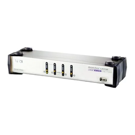 1x 4-Port USB Dual-View KVMP Switch 4x Custom KVM Cable (VGA, USB; 1.8m) 4x Custom KVM Cable (VGA, Audio; 1.8m) 1x Firmware Upgrade Cable 1x User Instructions. 4-Port USB VGA Dual Display/Audio KVMP Switch. Aten CS1744 KVM Switch integrates functions of video signal dual output and USB KVM switches. It allows a computer with dual-screen support to pair with two VGA/SVGA/Multisync displays via a USB keyboard and mouse. Allows one USB keyboard, USB mouse, speakers, microphone and 2 displays to control 4 dual display computers 2-port USB Hub built in With speaker and microphone support Buzzer On/Off via hotkey Keyboard and mouse emulation for error free booting Computer selection via front panel push buttons and hotkeys Firmware upgradeable OS Support: Windows 2000, Windows XP, Windows Vista, LINUX, Mac, Sun and FreeBSD. The CS1744 provides 1 USB port on the front and rear panels, allowing each server to share any USB peripheral device that is connected to this HUB