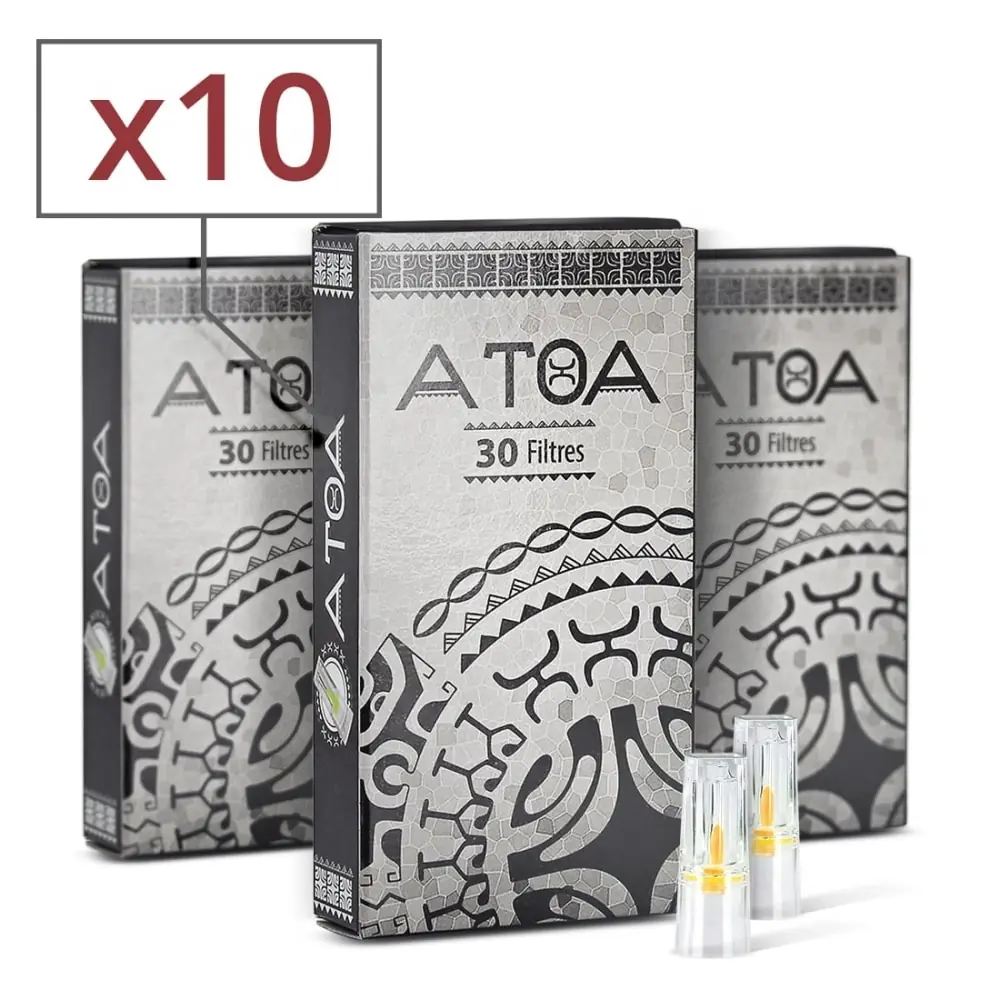 this set of 10 boxes of atoa cigarette filters will allow you to benefit from a large quantity of filters. indeed you can enjoy a total of 300 filters that will allow you to filter tar as well as nicotine. this range of french brand filters is intended for standard size cigarettes 100's cigarettes and cigarette tubes. it is recommended that you change the filter every 5 cigarettes or possibly when it turns brown.