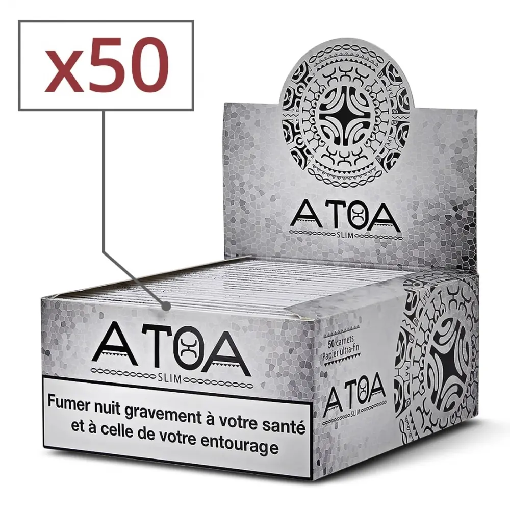 the atoa x 50 slim sheets are characterized by a good quality rolling paper. ultra thin and resistant. an easy to roll paper that sticks perfectly. each notebook consists of 32 sheets as well as a protective sheet. a witness sheet is also present to tell you that there are only 5 sheets left in your notebook.