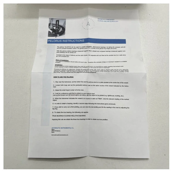 Autonautic Bracket Mount Professional Pelorus - TAX-00123 Product description: The Autonautic Bracket Mount Professional Pelorus - TAX-00123 is a precision instrument for navigation at sea. It is designed for accurate measurement of relative bearings and for observing other ships and objects on the water. The pelorus is easy to mount on a bracket or rail and can be used in conjunction with a compass for precise navigation. Features: High precision: The pelorus has an accuracy of 1 degree, allowing you to perform accurate measurements. Durable design: The pelorus is made from high-quality materials and is resistant to harsh weather conditions. Easy to use: The pelorus is simple to install and use, even for beginners. Versatile: The pelorus can be used for a variety of navigation purposes, including: Measuring relative bearings Observing other ships and objects Navigating in conjunction with a compass Specifications: Diameter of the card: 125 mm Graduation: 1 degree Materials: Aluminium, polyamide Storage box: Plywood with natural wood tones, 24 x 24 x 15 cm Weight: 2.5 kg Accessories: Storage box Mounting bracket User manual Order the Autonautic Bracket Mount Professional Pelorus - TAX-00123 today and experience the benefits of precise navigation at sea!