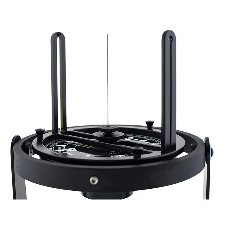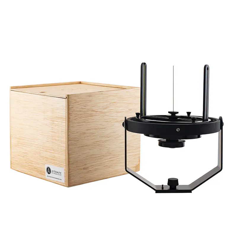 The Autonautic pelorus consists of a suspension system with a gimbal made up of a gimbal ring, a weight, and a stop. Mounted on the gimbal assembly is the rose with a diameter of 125 mm, the solar shadow pin, and two sighting blades.