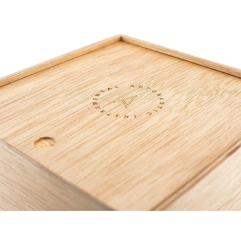 Plywood storage box finished in natural wood tones, its size is 24X24X15cm.