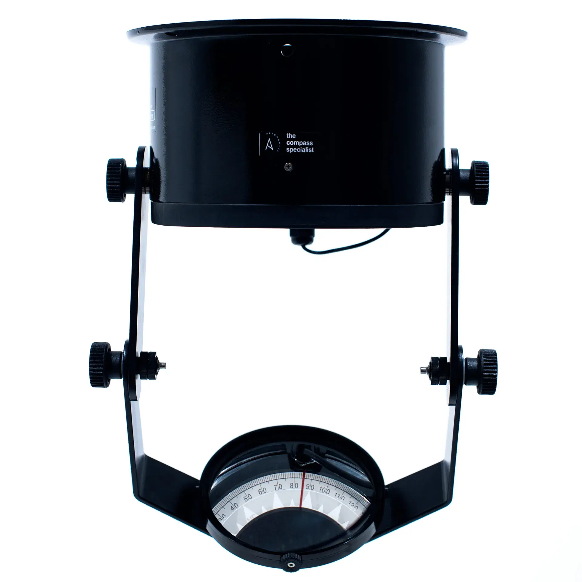 Ceiling compass with magnifying glass and rotating mirror for comfortable reading from the helmsman's position. A robust solution when it is not possible to use a reflection trunk, providing a rigid connection of the magnifying glass and mirror to the supports, thus preventing unwanted movement of the supports while following the swinging movements of the compass in rough seas.