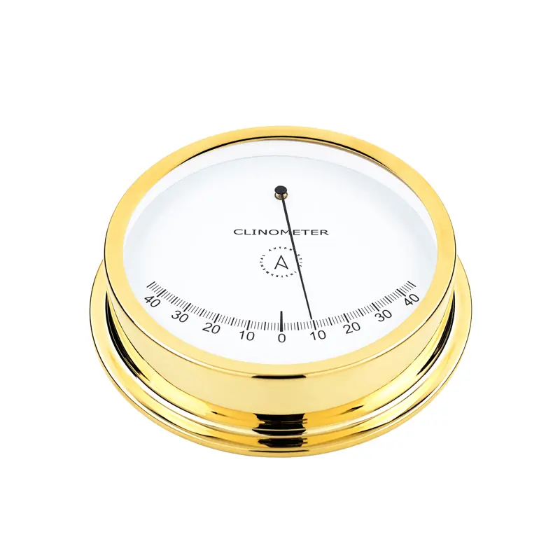 The Golden marine clinometer features a diameter of 175 mm and includes a mounting ring for easy installation and securing. The brass dials are plated in 18-carat "Flash" gold using advanced brass plating technology, ensuring that our instrument dials require no maintenance.