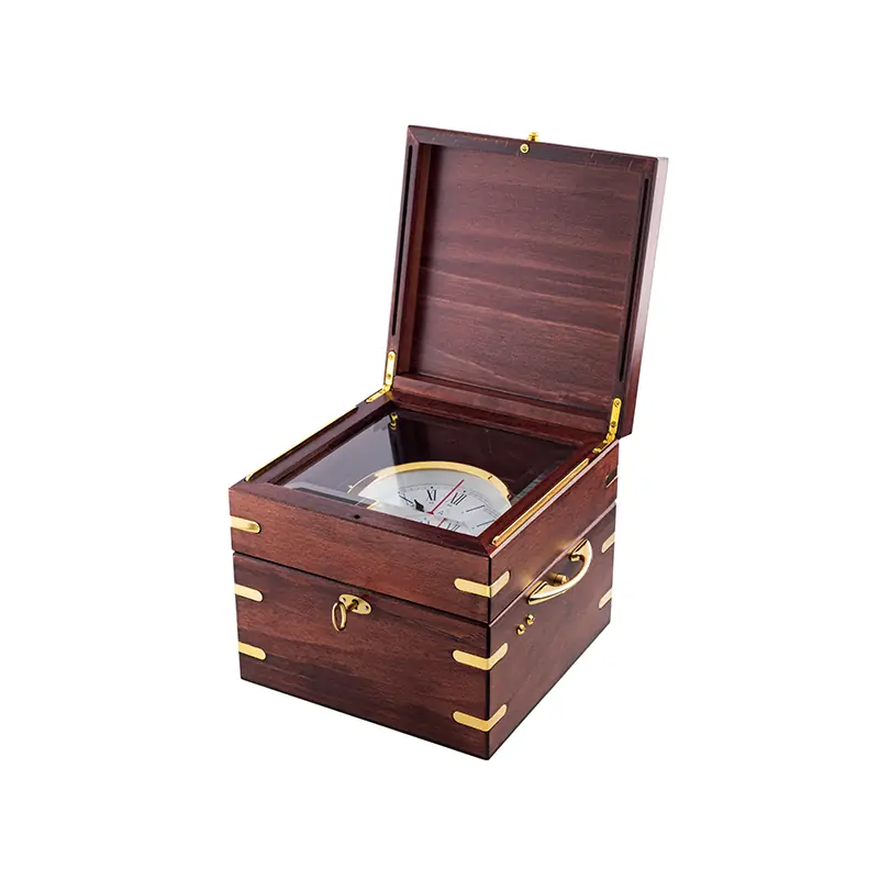 The case itself is made of premium beech wood with a mahogany finish, and features 18-carat gold accents on all the metal fittings. Thus, the guaranteed accuracy is less than 1 second of error per day.
