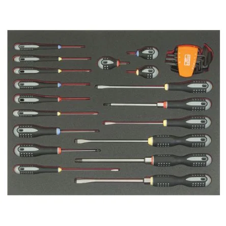 BE-8210 Screwdriver ERGO 0,4X2,5X75 BE-8030 Screwdriver ERGO 0,6X3,5X75 BE-8040 Screwdriver ERGO 0,8X4,0X100 BE-8350 Screwdriver ERGO 1X5,5X25 BE-8242 Screwdriver ERGO 1,0X5,5X150 BE-8252 Screwdriver ERGO 1,2X6,5X150 BE-8257 Screwdriver ERGO 1,2X8,0X175 BE-8258 Screwdriver ERGO 1,6X10,0X200 BE-8880 Screwdriver ERGO 2,0X12,0X200 BE-8602 Screwdriver ERGO PH2X25 BE-8610 Screwdriver ERGO PH1X75 BE-8620 Screwdriver ERGO PH2X100 BE-8630 Screwdriver ERGO PH3X150 BE-8640 Screwdriver ERGO PH4X200 BE-8800 Screwdriver ERGO PZ0X60 BE-8802 Screwdriver ERGO PZ2X25 BE-8810 Screwdriver ERGO PZ1X75 BE-8820 Screwdriver ERGO PZ2X100 BE-9578 Screwdriver SET HEX BLACK 9 PCS. Bahco 27 piece Screwdriver ; Hex Key Kit in Modular Foam Insert. This Modular Foam kit from Bahco offers a 27 piece set of screwdrivers and hex keys. Featuring tools from the ERGO range that are scientifically designed to help prevent musculoskeletal issues. The tool fits your hand like no other and sends the same power from a more relaxed grip. The kit comes in a modular foam tray. It is designed to fit in tool chests, trolleys and drawers and is a world renowned method of storing tools. The foam protects the tools, helps identification of parts and size as well as clearly showing if any are missing. Impact Resistant ABS Resistant to Oil and Acids FOD System: 2 colour foam insert provides complete visual check of missing items Each tool is securely held in its own insert, following the FOD system Push up system to facilitate the removal of the tools Developed to work in the most demanding environments, reducing the risk of losing tools