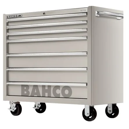 Bahco Wheeled Roller CabinetThe Bahco S75 classic tool is trolley type having roller wheels. This trolley has a sturdy design with rounded corners to ensure maximum protection without sharp edges. The Safe and smart Lock&Go system prevent the stainless-steel drawers from opening when the tool trolley moves. This tool can bear large capacity due to heavy duty construction. It has a length of 650mm, a width of 1260mm and height of 1200mm.Features and Benefits• Has seven drawers • Anti-theft round locking system • Double-walled reinforced frame with extra welding points • Fully opening stainless steel drawers equipped with ball-bearing sliders • Long drawer rails with ball bearings and fully openable drawers • Smooth and silent rubber wheels ensure maximum stability • The inside and outside of the case and drawers have a scratchproof and anti-rust powder coatingApplications• Storage of tools
