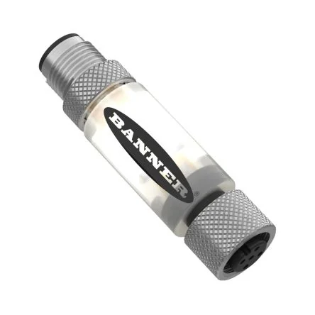 The Banner 2-Color In-Line sensor status indicator has bright indication to indicate sensor power and output status. It has two colours - one for power and one for sensor output status. The indicator is connected directly to a sensor or anywhere in-line for easy visual indication. The models available with PNP or NPN input.Voltage 24 V dc Housing PVC IP67 rated Colours cool white Male-female euro 4-pin quick-disconnect connector