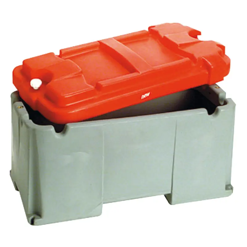 Durable battery box for high-capacity batteries, compliant with DIN standards.