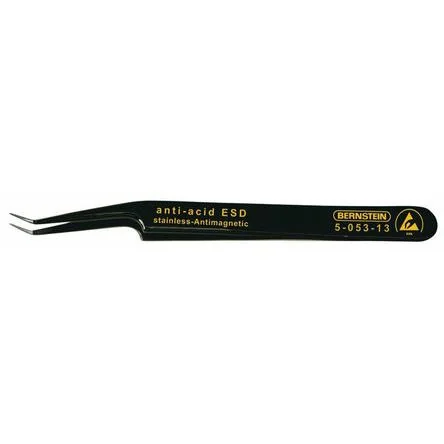 Bernstein ESD tweezers are made of stainless steel with oblique tips, ideal for precision tasks in ESD-sensitive environments.