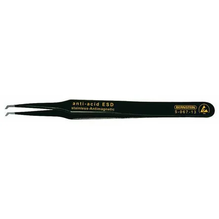 Bernstein ESD Precision Surface Mount Tweezers (SA). ESD safe dissipative precision highly accurate tweezers manufactured from high grade Steel for excellent consistency and Anti-corrosion properties. Ideal for use in SMD ; SMT where Electrostatic Discharge is a concern.. Small extremely hard precision machined tips for unrivalled strength and durability Chrome Nickel high grade Steel construction for excellent durability, strength and handling Stainless and Anti-magnetic (SA) Acid resistant Matt finish Marked with the part number and special properties on the handle for quick identification of the right tool for the job