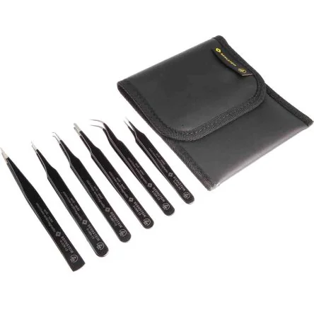 Nylon storage wallet. Bernstein 6 Piece ESD Surface Mount Tweezer Kit (5-060). ESD safe dissipative 6 piece precision highly accurate tweezer kit manufactured from high grade Steel for excellent consistency and Anti-corrosion properties. Ideal for use in SMD ; SMT where Electrostatic Discharge is a concern.. Small extremely hard precision machined tips for unrivalled strength and durability Chrome Nickel high grade Steel construction for excellent durability, strength and handling Stainless and Anti-magnetic (SA) Acid resistant Matt finish Marked with the part number and special properties on the handle for quick identification of the right tool for the job