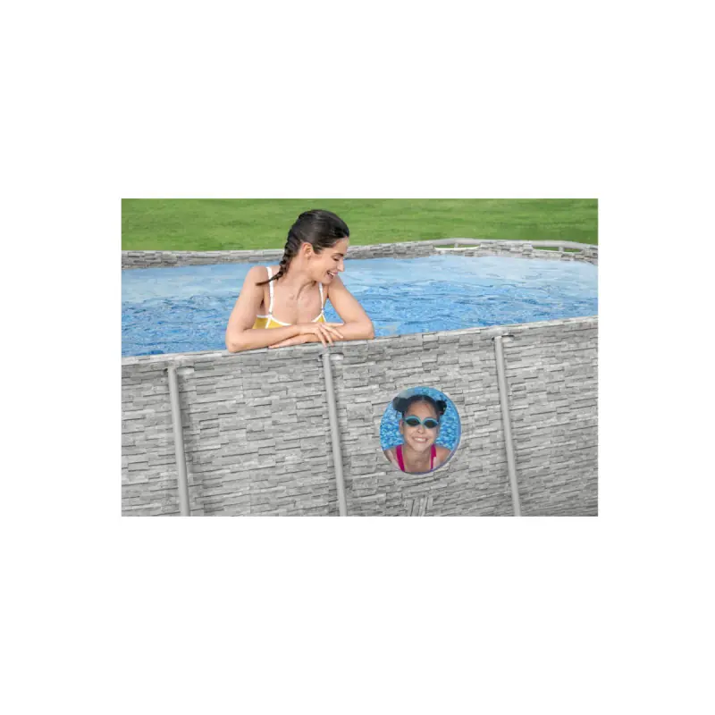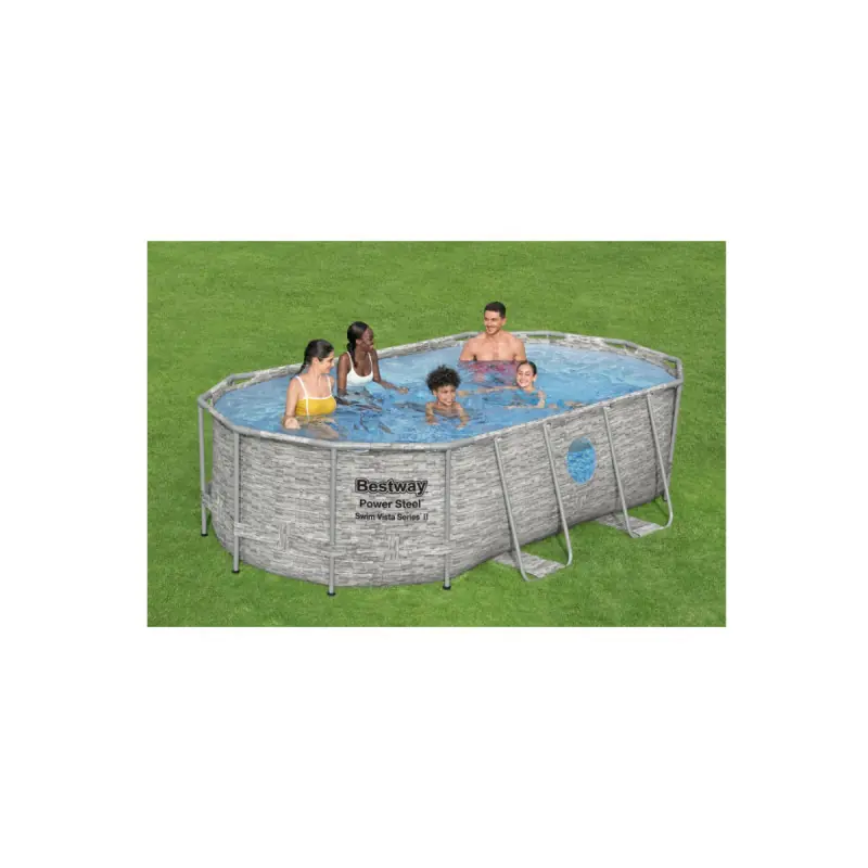 The BESTWAY oval tubular pool - 427 x 250 x 100 cm - 7,250 L - rattan pattern - Power Steel - SwimVista - 56714 will be ideal for combating the summer heat in complete relaxation in your garden. With its large dimensions, it can accommodate several people for enjoyable moments with family or friends. With a height of just 1 m, even children can swim without any problems. Unlike other Power Steel pools, this one features two portholes for added fun. The kit is designed to simplify installation for users without the need for any tools. The pool has a good lifespan thanks to its Tritech liner, which is highly resistant to UV treatment protecting against the sun, as well as corrosion treatment of the structure and the Seal & Lock system that prevents friction between the tubes while limiting the appearance of rust. As for the water in the pool, the pump helps to clean the basin, and the chlorine dispenser fights against bacteria. A ladder is also included in the box for entering the pool.