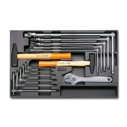The BETA T59 is the tool kit consist of the adjustable wrench, t handle wrenches and engineers hammers. The whole tool kit consist of the 14 pieces.The tools are arrange in hard thermoformed trey