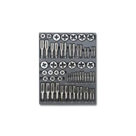 The BETA T270 tool kit features 60 pieces, including taps and round dies, arranged in a hard thermoformed tray.