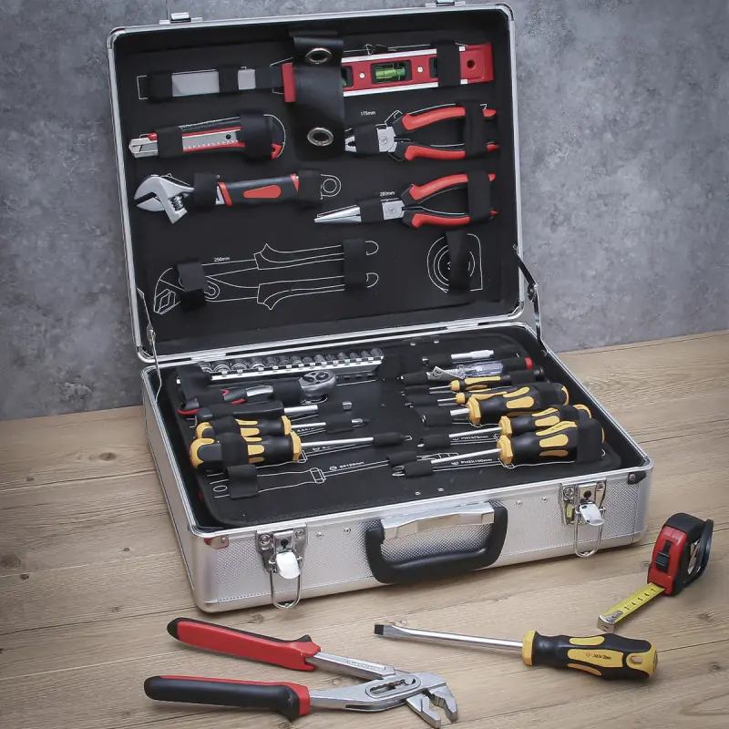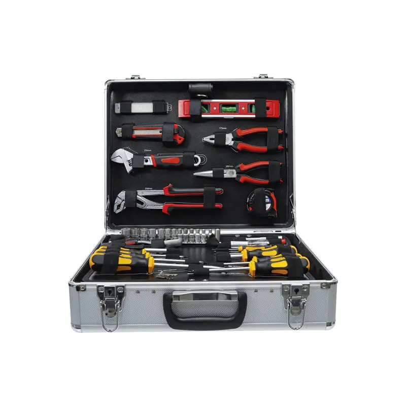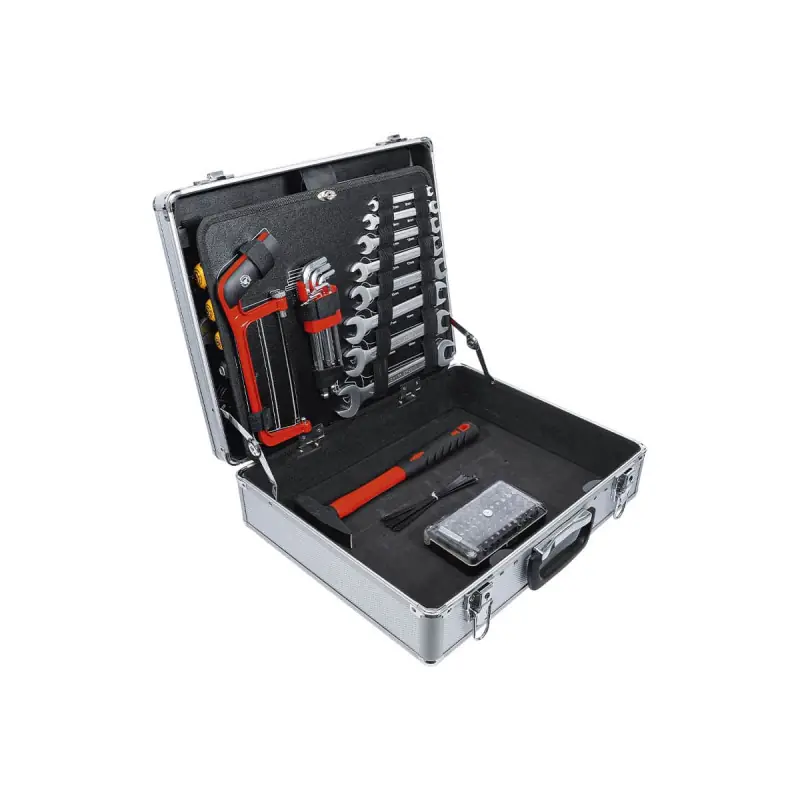 BGS Tool Box - Aluminium Case - 129 pcs - 2204 tool set in an aluminium case with a foldable base including a large number of essential tools for carrying out small or large jobs. This small case also complies with safety regulations with its lockable closure system.