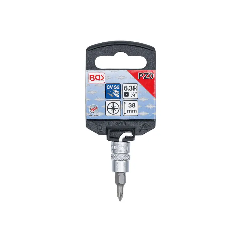 A BGS TECHNIC Bit Socket - 6 3 mm - Crosshead PZ0 - 2505 for tightening or loosening PZ0 crosshead screws that will be very useful in your workshop. You can use it for many screwing tasks as it is resistant even to corrosion being made of chrome-vanadium steel.