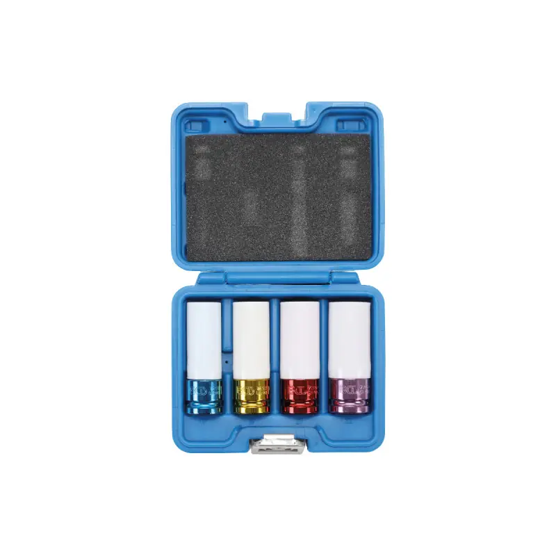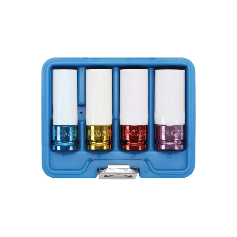 This impact socket set with protection BGS TECHNIC - 12.5 mm - 4 pcs - 9847 contains 4 sockets with female square drive 12.5 mm (1/2") of 17, 19, 21, and 22 mm. They are suitable for impact wrenches as well as manual screwdrivers. Their construction features a sleeve and a plastic insert that protect aluminium rims. Equipped with a pin retention and rubber seal, they are easily identifiable thanks to the colour-coded nuts.