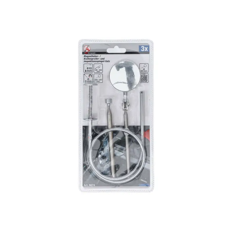 Magnetic Lifting Tool Set - Flexible Tweezers and Inspection Mirror BGS - 3 pcs - 6874 work surgically with tweezers to grab nuts, bolts, and other components, a magnet to pick up metal objects, and a mirror for calm work in hard-to-reach places.