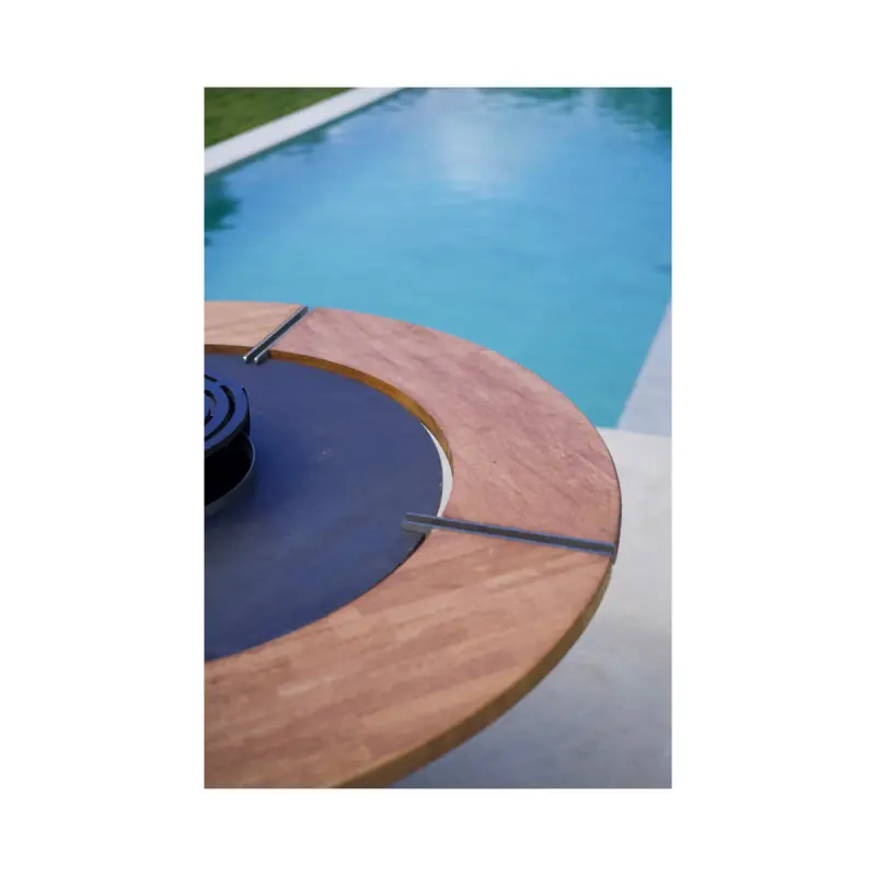 Create a friendly and practical space around your Braséro 85 with this quarter contour made of laminated rubberwood. Designed for easy assembly (up to four modules for a complete contour), this elegant edge provides a true work surface all around your braséro. Its stable solid wood structure is heat-resistant and protected by three layers of clear food-grade oil that reveal the natural beauty of the wood. Each quarter is equipped with two solid stainless steel side hooks (5 mm thick) for a strong and secure attachment to the braséro bowl. With a width of 25 cm and a thickness of 33 mm, this module allows you to place utensils, boards, or glasses within reach, transforming your braséro into a true ergonomic and warm cooking space. This quarter can be assembled with other pieces to form a semicircle, a 3/4 circle, or a complete circle depending on your needs.