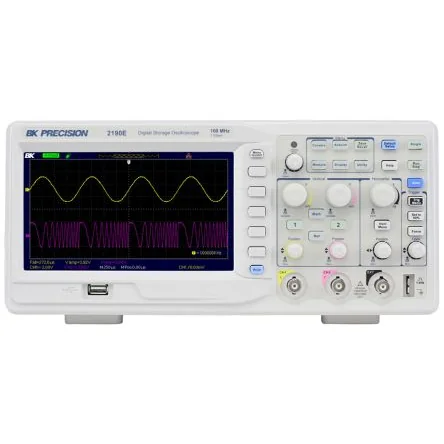The BK2190E oscilloscope combines performance and value all in one portable solution. With advanced triggering capabilities, long waveform memory up to 40,000 points, and extensive features such as pass/fail limit testing, digital filtering, waveform recorder, and 32 automatic measurements, this oscilloscope offers powerful tools in a small affordable package.100 MHz bandwidth, 1 GSa/s sample rate Large, 7”; widescreen color display with 800 x 480 resolution offers a significantly larger viewing area than typical economy oscilloscopes (5.7”;) 32 automatic measurements FFT plus four additional math functions Versatile triggering capabilities including pulse width, line-selectable video, slope, and alternating trigger Advanced tools include digital filter with adjustable limits, pass/fail testing, and waveform recorder mode 12 different language user interfaces and context sensitive help Special EDU mode allows educators to disable Auto set button, Measure menu, and Cursors menu PC software that lets you remotely control the digital storage oscilloscope and capture, save, and analyze waveform data Front panel USB host port for saving and recalling waveform setups, data, and screen shots from the oscilloscope on to a USB flash drive LAN and USBTMC compliant USB device port supporting SCPI commands for remote PC control GPIB connectivity with optional USB-to-GPIB adapter (model AK40G)